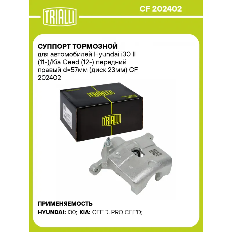 Суппорт тормозной для автомобилей Hyundai i30 II (11-)/Kia Ceed (12-) передний правый d=57мм (диск 23мм) Характеристики: Артикул: CF 202402 OEM номера: 58190 A6A03, 58190 A6A00, 58190 A6A01, 58130 A6000 Тормозная система: MOBIS Диаметр, мм: 57 Гарантийный срок: 2 года / 60 000 км Количество поршней: 1 Толщина тормозного диска, мм: 23 Сторона установки: Передняя ось справа Сопутствующий товар: Ремкомплект суппорта: RCF 202401 Сопутствующий товар: Поршень суппорта: RCF 202402 Сопутствующий товар: Скоба суппорта: CF 202403 Сопутствующий товар: Суппорт тормозной: CF 202401 Парный товар: CF 202401 Количество на автомобиль: 1 Товарная линейка: BLACK Комплектация: Скоба дискового тормозного механизма (суппорт тормозной без направляющей колодок) - 1 шт Гарантия: от 1 года.