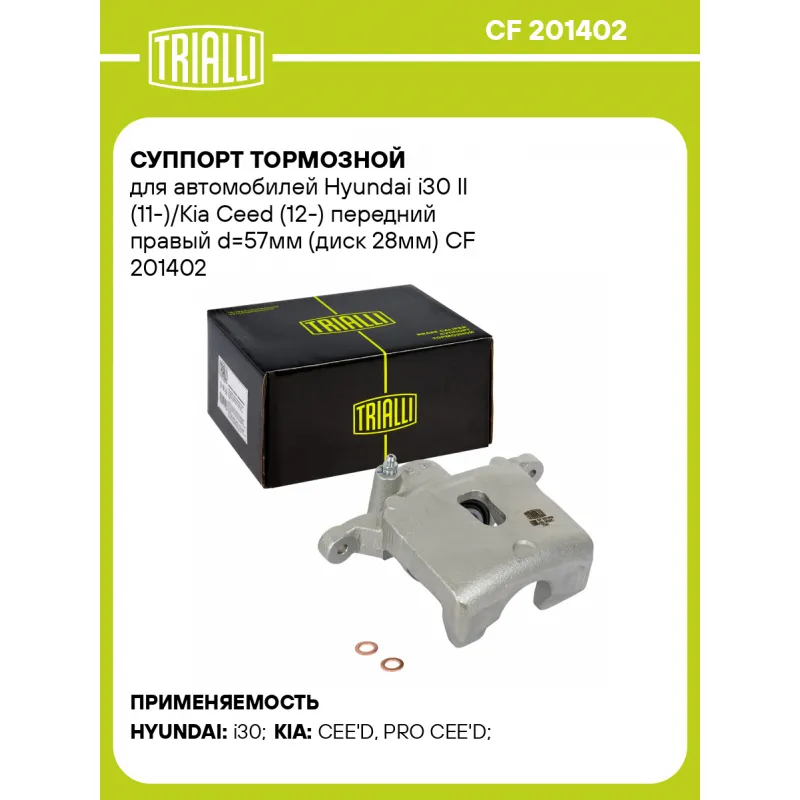 Суппорт тормозной для автомобилей Hyundai i30 II (11-)/Kia Ceed (12-) передний правый d=57мм (диск 28мм) Характеристики: Артикул: CF 201402 OEM номера: 58130 A6200, 58130 A6700, 58190 A6A20, 58190 A6A70, 58130-A2250, 58190-A2A25 Тормозная система: MOBIS Диаметр, мм: 57 Гарантийный срок: 2 года / 60 000 км Количество поршней: 1 Толщина тормозного диска, мм: 28 Сторона установки: Передняя ось справа Сопутствующий товар: Ремкомплект суппорта: RCF 201401 Сопутствующий товар: Поршень суппорта: RCF 201402 Сопутствующий товар: Скоба суппорта: CF 201403 Сопутствующий товар: Суппорт тормозной: CF 201401 Парный товар: CF 201401 Количество на автомобиль: 1 Товарная линейка: BLACK Комплектация: Скоба дискового тормозного механизма (суппорт тормозной без направляющей колодок) - 1 шт Гарантия: от 1 года.
