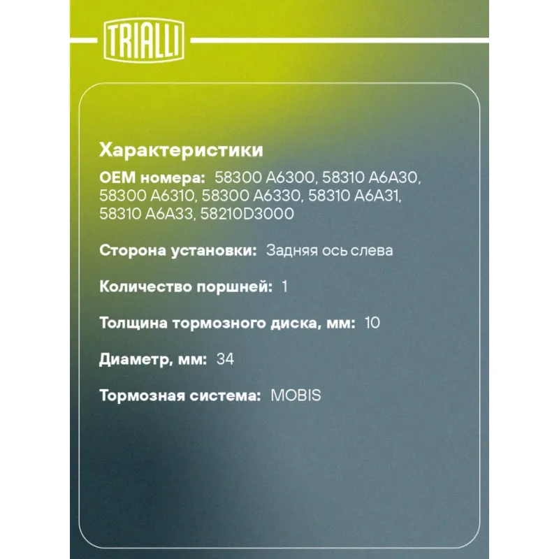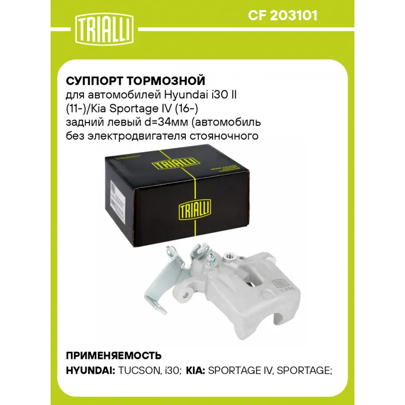 Суппорт тормозной для автомобилей Hyundai i30 II (11-)/Kia Sportage IV (16-) задний левый d=34мм (автомобиль без электродвигателя стояночного тормоза) Характеристики: Артикул: CF 203101 OEM номера: 58300 A6300, 58310 A6A30, 58300 A6310, 58300 A6330, 58310 A6A31, 58310 A6A33, 58210D3000 Особенности конструкции:: Для автомобилей без электрического стояночного тормоза Тормозная система: MOBIS Диаметр, мм: 34 Гарантийный срок: 2 года / 60 000 км Количество поршней: 1 Толщина тормозного диска, мм: 10 Сторона установки: Задняя ось слева Сопутствующий товар: Ремкомплект суппорта: RCF 203101 Сопутствующий товар: Поршень суппорта: RCF 203102 Сопутствующий товар: Скоба суппорта: CF 203103 Сопутствующий товар: Суппорт тормозной: CF 203102 Парный товар: CF 203102 Количество на автомобиль: 1 Товарная линейка: BLACK Комплектация: Скоба дискового тормозного механизма (суппорт тормозной без направляющей колодок) - 1 шт Гарантия: от 1 года.