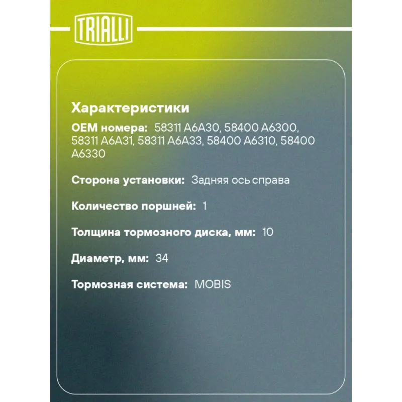 Суппорт тормозной для автомобилей Hyundai i30 II (11-)/Kia Sportage IV (16-) задний правый d=34мм (автомобиль без электродвигателя стояночного тормоза) Характеристики: Артикул: CF 203102 OEM номера: 58311 A6A30, 58400 A6300, 58311 A6A31, 58311 A6A33, 58400 A6310, 58400 A6330 Особенности конструкции:: Для автомобилей без электрического стояночного тормоза Тормозная система: MOBIS Диаметр, мм: 34 Гарантийный срок: 2 года / 60 000 км Количество поршней: 1 Толщина тормозного диска, мм: 10 Сторона установки: Задняя ось справа Сопутствующий товар: Ремкомплект суппорта: RCF 203101 Сопутствующий товар: Поршень суппорта: RCF 203102 Сопутствующий товар: Скоба суппорта: CF 203103 Сопутствующий товар: Суппорт тормозной: CF 203101 Парный товар: CF 203101 Количество на автомобиль: 1 Товарная линейка: BLACK Комплектация: Скоба дискового тормозного механизма (суппорт тормозной без направляющей колодок) - 1 шт Гарантия: от 1 года.