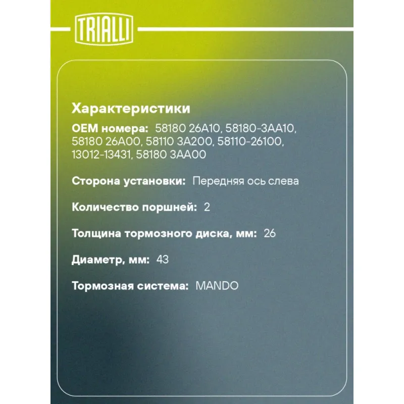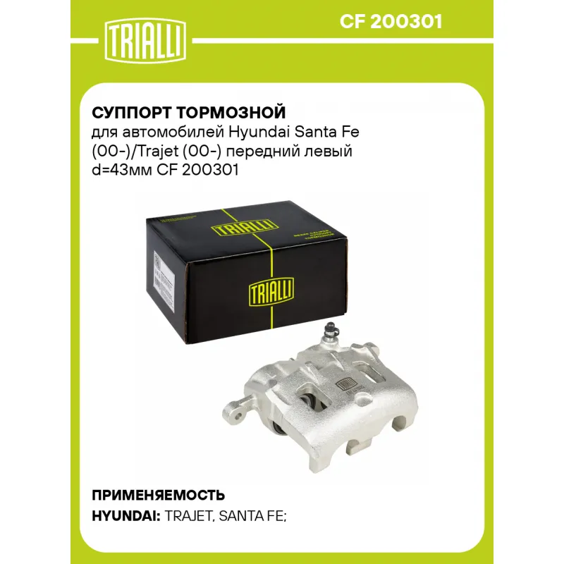 Суппорт тормозной для автомобилей Hyundai Santa Fe (00-)/Trajet (00-) передний левый d=43мм Характеристики: Артикул: CF 200301 OEM номера: 58180 26A10, 58180-3AA10, 58180 26A00, 58110 3A200, 58110-26100, 13012-13431, 58180 3AA00 Тормозная система: MANDO Диаметр, мм: 43 Гарантийный срок: 2 года / 60 000 км Количество поршней: 2 Толщина тормозного диска, мм: 26 Сторона установки: Передняя ось слева Сопутствующий товар: Ремкомплект суппорта: RCF 200301 Сопутствующий товар: Поршень суппорта: RCF 200302 Сопутствующий товар: Скоба суппорта: CF 200303 Сопутствующий товар: Суппорт тормозной: CF 200302 Парный товар: CF 200302 Количество на автомобиль: 1 Товарная линейка: BLACK Комплектация: Скоба дискового тормозного механизма (суппорт тормозной без направляющей колодок) - 1 шт Гарантия: от 1 года.