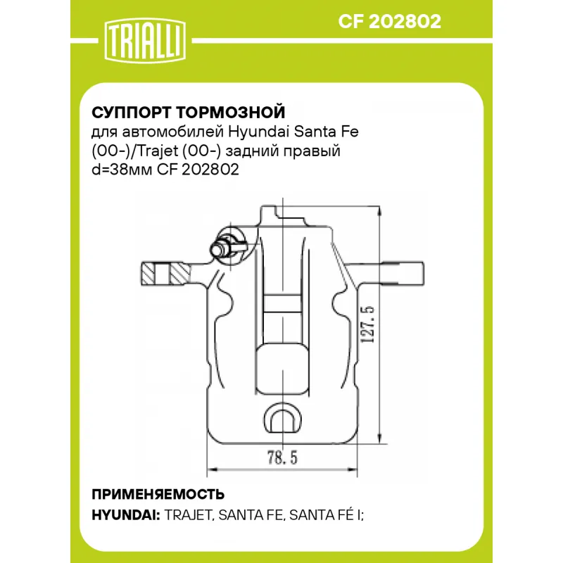 Суппорт тормозной для автомобилей Hyundai Santa Fe (00-)/Trajet (00-) задний правый d=38мм Характеристики: Артикул: CF 202802 OEM номера: 58400 26050, 58310-26A00, 58230 3A200, 58311 3AA00 Тормозная система: MANDO Диаметр, мм: 38 Гарантийный срок: 2 года / 60 000 км Количество поршней: 1 Толщина тормозного диска, мм: 10 Сторона установки: Задняя ось справа Сопутствующий товар: Ремкомплект суппорта: RCF 202801 Сопутствующий товар: Поршень суппорта: RCF 202802 Сопутствующий товар: Скоба суппорта: CF 202803 Сопутствующий товар: Суппорт тормозной: CF 202801 Парный товар: CF 202801 Количество на автомобиль: 1 Товарная линейка: BLACK Комплектация: Скоба дискового тормозного механизма (суппорт тормозной без направляющей колодок) - 1 шт Гарантия: от 1 года.