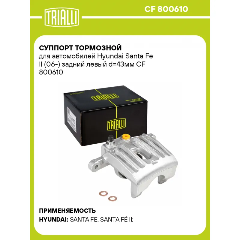 Суппорт тормозной для автомобилей Hyundai Santa Fe II (06-) задний левый d=43мм Характеристики: Артикул: CF 800610 OEM номера: 58210 2B700, 58310 2BA00 Тормозная система: MANDO Диаметр, мм: 43 Гарантийный срок: 2 года / 60 000 км Количество поршней: 1 Толщина тормозного диска, мм: 10 Сторона установки: Задняя ось слева Сопутствующий товар: Ремкомплект суппорта: RCF 800610 Сопутствующий товар: Поршень суппорта: RCF 800611 Сопутствующий товар: Скоба суппорта: CF 800612 Сопутствующий товар: Суппорт тормозной: CF 800611 Диаметр тормозного диска, мм: 302 Парный товар: CF 800611 Количество на автомобиль: 1 Товарная линейка: BLACK Комплектация: Скоба дискового тормозного механизма (суппорт тормозной без направляющей колодок) - 1 шт Гарантия: от 1 года.
