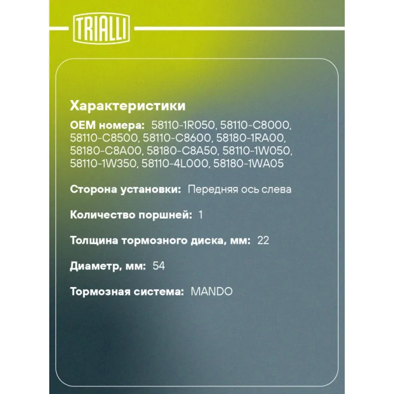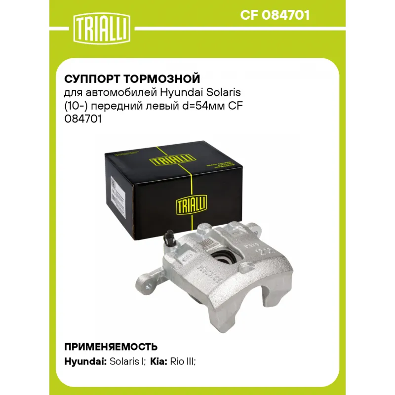 Суппорт тормозной для автомобилей Hyundai Solaris (10-) передний левый d=54мм Характеристики: Артикул: CF 084701 OEM номера: 58110-1R050, 58110-C8000, 58110-C8500, 58110-C8600, 58180-1RA00, 58180-C8A00, 58180-C8A50, 58110-1W050, 58110-1W350, 58110-4L000, 58180-1WA05 Сопутствующий товар: Ремкомплект суппорта: RCF 084701 Сопутствующий товар: Поршень суппорта: RCF 084702 Сопутствующий товар: Скоба суппорта: CF 084721 Сопутствующий товар: Суппорт тормозной: CF 084702 Парный товар: CF 084702 Количество на автомобиль: 1 Диаметр, мм: 54 Количество поршней: 1 Гарантийный срок: 2 года / 60 000 км Толщина тормозного диска, мм: 22 Тормозная система: MANDO Сторона установки: Передняя ось слева Товарная линейка: BLACK Подходит для авто: Hyundai Solaris I (10-) Kia Rio III (11-), Rio III (11-) Для проверки применяемости отправьте VIN автомобиля через вкладку "Есть вопросы о товаре?" Комплектация: Скоба дискового тормозного механизма (суппорт тормозной без направляющей колодок) - 1 шт Гарантия: от 1 года.