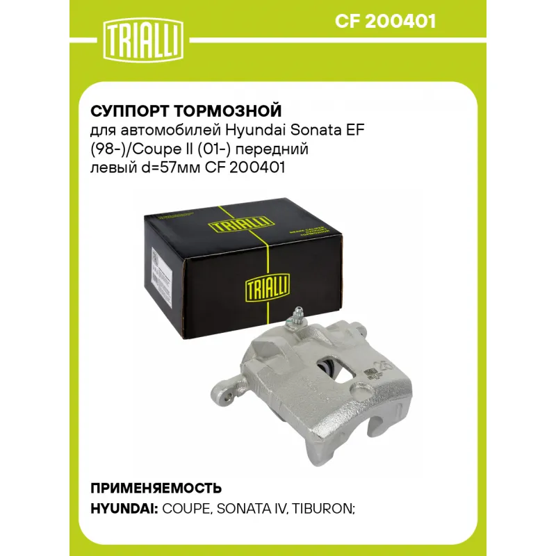 Суппорт тормозной для автомобилей Hyundai Sonata EF (98-)/Coupe II (01-) передний левый d=57мм Характеристики: Артикул: CF 200401 OEM номера: 58180 2CA10, 58180 38A10, 58180 38A11, 581102C400 Тормозная система: MANDO Диаметр, мм: 57 Гарантийный срок: 2 года / 60 000 км Количество поршней: 1 Толщина тормозного диска, мм: 26 Сторона установки: Передняя ось слева Сопутствующий товар: Ремкомплект суппорта: RCF 200401 Сопутствующий товар: Поршень суппорта: RCF 200402 Сопутствующий товар: Скоба суппорта: CF 200403 Сопутствующий товар: Суппорт тормозной: CF 200402 Парный товар: CF 200402 Количество на автомобиль: 1 Товарная линейка: BLACK Комплектация: Скоба дискового тормозного механизма (суппорт тормозной без направляющей колодок) - 1 шт Гарантия: от 1 года.