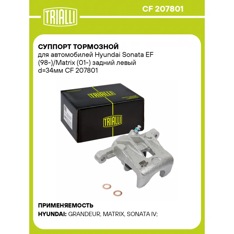 Суппорт тормозной для автомобилей Hyundai Sonata EF (98-)/Matrix (01-) задний левый d=34мм Характеристики: Артикул: CF 207801 OEM номера: 58210 17300, 58310 38A10 Тормозная система: MANDO Диаметр, мм: 34 Гарантийный срок: 2 года / 60 000 км Количество поршней: 1 Толщина тормозного диска, мм: 10 Сторона установки: Задняя ось слев... Читать полностью →