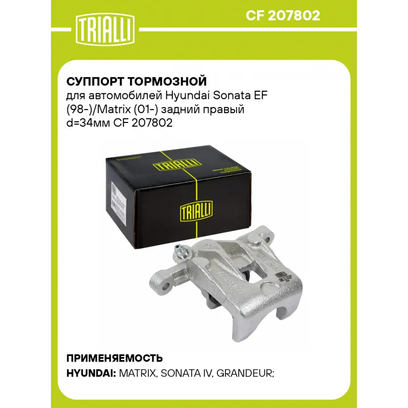 Суппорт тормозной для автомобилей Hyundai Sonata EF (98-)/Matrix (01-) задний правый d=34мм Характеристики: Артикул: CF 207802 OEM номера: 58230 17300, 58311 38A10 Тормозная система: MANDO Диаметр, мм: 34 Гарантийный срок: 2 года / 60 000 км Количество поршней: 1 Толщина тормозного диска, мм: 10 Сторона установки: Задняя ось спр... Читать полностью →