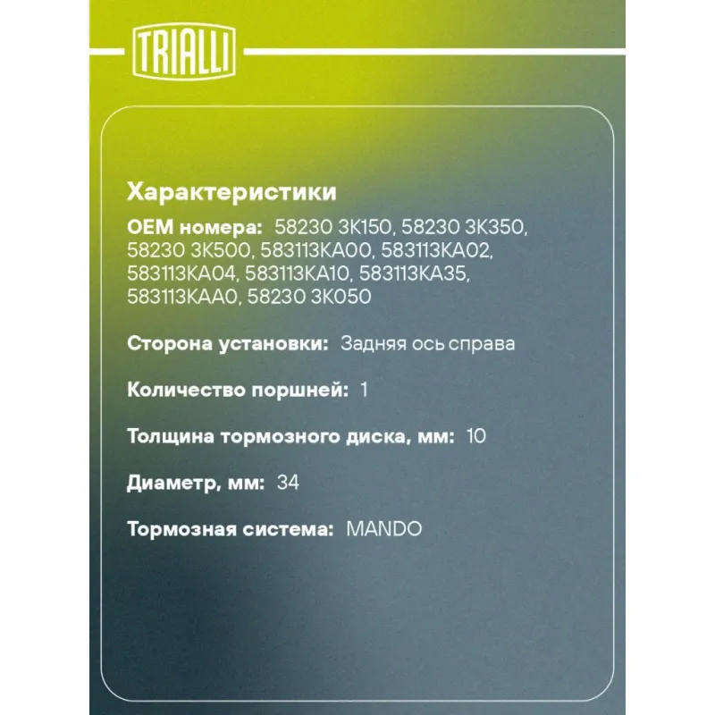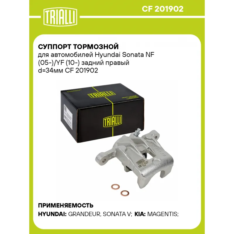Суппорт тормозной для автомобилей Hyundai Sonata NF (05-)/YF (10-) задний правый d=34мм Характеристики: Артикул: CF 201902 OEM номера: 58230 3K150, 58230 3K350, 58230 3K500, 583113KA00, 583113KA02, 583113KA04, 583113KA10, 583113KA35, 583113KAA0, 58230 3K050 Тормозная система: MANDO Диаметр, мм: 34 Гарантийный срок: 2 года / 60 000 км Количество поршней: 1 Толщина тормозного диска, мм: 10 Сторона установки: Задняя ось справа Парный товар: CF 201901 Количество на автомобиль: 1 Товарная линейка: BLACK Комплектация: Скоба дискового тормозного механизма (суппорт тормозной без направляющей колодок) - 1 шт Гарантия: от 1 года.