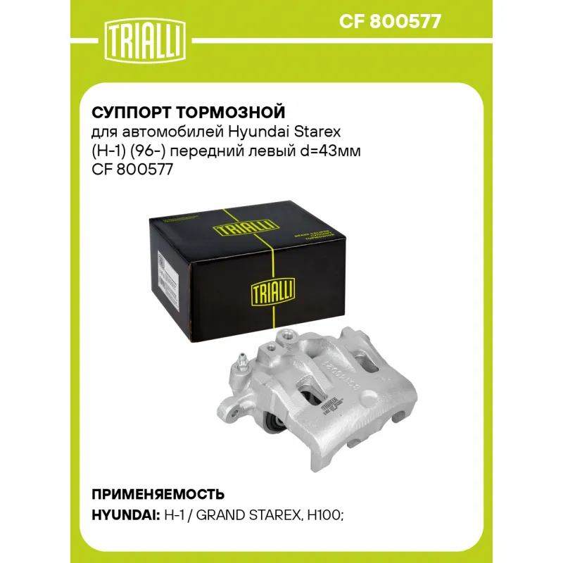 Суппорт тормозной для автомобилей Hyundai Starex (H-1) (96-) передний левый d=43мм Характеристики: Артикул: CF 800577 OEM номера: 58180 4AA00 Тормозная система: MANDO Диаметр, мм: 43 Гарантийный срок: 2 года / 60 000 км Количество поршней: 2 Толщина тормозного диска, мм: 24 Сторона установки: Передняя ось слева Сопутствующий товар: Ремкомплект суппорта: RCF 800577 Сопутствующий товар: Поршень суппорта: RCF 800578 Сопутствующий товар: Скоба суппорта: CF 800579 Сопутствующий товар: Суппорт тормозной: CF 800578 Диаметр тормозного диска, мм: 227 Парный товар: CF 800578 Количество на автомобиль: 1 Товарная линейка: BLACK Комплектация: Скоба дискового тормозного механизма (суппорт тормозной без направляющей колодок) - 1 шт Гарантия: от 1 года.