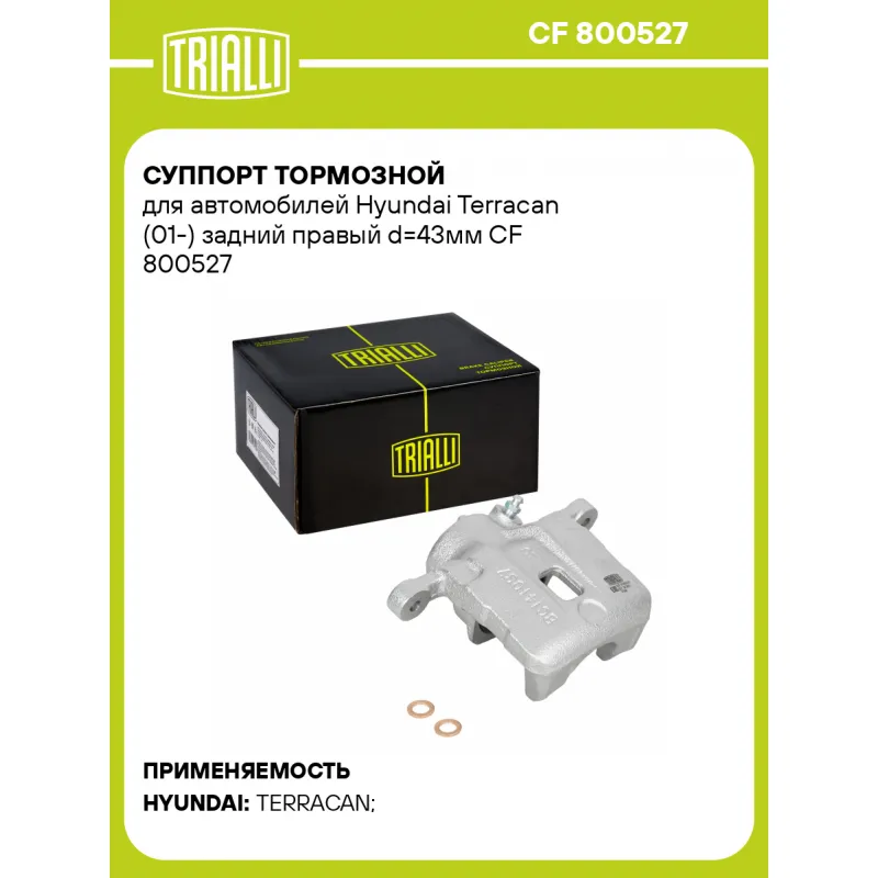Суппорт тормозной для автомобилей Hyundai Terracan (01-) задний правый d=43мм Характеристики: Артикул: CF 800527 OEM номера: 58311 H1010, 58311H1A00, 58311H1A10 Тормозная система: MANDO Диаметр, мм: 43 Гарантийный срок: 2 года / 60 000 км Количество поршней: 1 Толщина тормозного диска, мм: 20 Сторона установки: Задняя ось справа Сопутствующий товар: Ремкомплект суппорта: RCF 800526 Сопутствующий товар: Поршень суппорта: RCF 800527 Сопутствующий товар: Скоба суппорта: CF 800528 Сопутствующий товар: Суппорт тормозной: CF 800526 Диаметр тормозного диска, мм: 315 Парный товар: CF 800526 Количество на автомобиль: 1 Товарная линейка: BLACK Комплектация: Скоба дискового тормозного механизма (суппорт тормозной без направляющей колодок) - 1 шт Гарантия: от 1 года.
