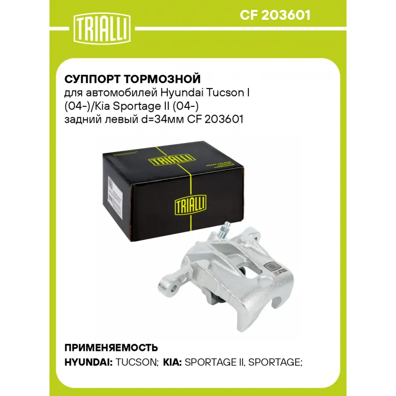Суппорт тормозной для автомобилей Hyundai Tucson I (04-)/Kia Sportage II (04-) задний левый d=34мм Характеристики: Артикул: CF 203601 OEM номера: 58310-2EA10, 58310-2EA00, 58210 2E000, 58210 2E300 Тормозная система: MANDO Диаметр, мм: 34 Гарантийный срок: 2 года / 60 000 км Количество поршней: 1 Толщина тормозного диска, мм: 10 Сторона установки: Задняя ось слева Сопутствующий товар: Ремкомплект суппорта: RCF 203601 Сопутствующий товар: Поршень суппорта: RCF 203602 Сопутствующий товар: Скоба суппорта: CF 203603 Сопутствующий товар: Суппорт тормозной: CF 203602 Парный товар: CF 203602 Количество на автомобиль: 1 Товарная линейка: BLACK Комплектация: Скоба дискового тормозного механизма (суппорт тормозной без направляющей колодок) - 1 шт Гарантия: от 1 года.