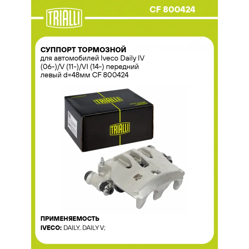 Суппорт тормозной для автомобилей Iveco Daily IV (06-)/V (11-)/VI (14-) передний левый d=48мм Характеристики: Артикул: CF 800424 OEM номера: 42555557, 42560072, 504120470, 504139833, A42560072 Тормозная система: BREMBO Диаметр, мм: 48 Гарантийный срок: 2 года / 60 000 км Количество поршней: 2 Толщина тормозного диска, мм: 28 Сторона установки: Передняя ось слева Сопутствующий товар: Ремкомплект суппорта: RCF 800424 Сопутствующий товар: Поршень суппорта: RCF 800425 Сопутствующий товар: Скоба суппорта: CF 800426 Сопутствующий товар: Суппорт тормозной: CF 800425 Парный товар: CF 800425 Количество на автомобиль: 1 Товарная линейка: BLACK Комплектация: Скоба дискового тормозного механизма (суппорт тормозной без направляющей колодок) - 1 шт Гарантия: от 1 года.