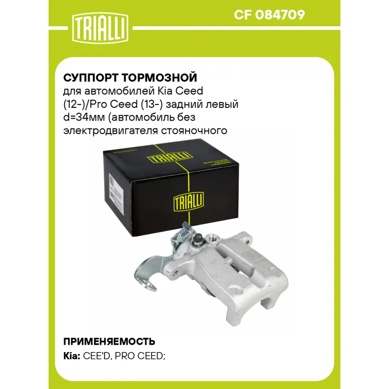Суппорт тормозной для автомобилей Kia Ceed (12-)/Pro Ceed (13-) задний левый d=34мм (автомобиль без электродвигателя стояночного тормоза) Характеристики: Артикул: CF 084709 OEM номера: 58310A2A30, 58300A2300 Особенности конструкции:: Для автомобилей с электрическим стояночным тормозом Сопутствующий товар: Ремкомплект суппорта: RCF 084709 Сопутствующий товар: Поршень суппорта: RCF 084710 Сопутствующий товар: Суппорт тормозной: CF 084710 Диаметр тормозного диска, мм: 262 Парный товар: CF 084710 Количество на автомобиль: 1 Диаметр, мм: 34 Количество поршней: 1 Гарантийный срок: 2 года / 60 000 км Толщина тормозного диска, мм: 10 Тормозная система: TRW Сторона установки: Задняя ось слева Товарная линейка: BLACK Подходит для авто: Kia CEE'D (12-), PRO CEED (JD) (13-) Для проверки применяемости отправьте VIN автомобиля через вкладку "Есть вопросы о товаре?" Комплектация: Скоба дискового тормозного механизма (суппорт тормозной без направляющей колодок) - 1 шт Гарантия: от 1 года.