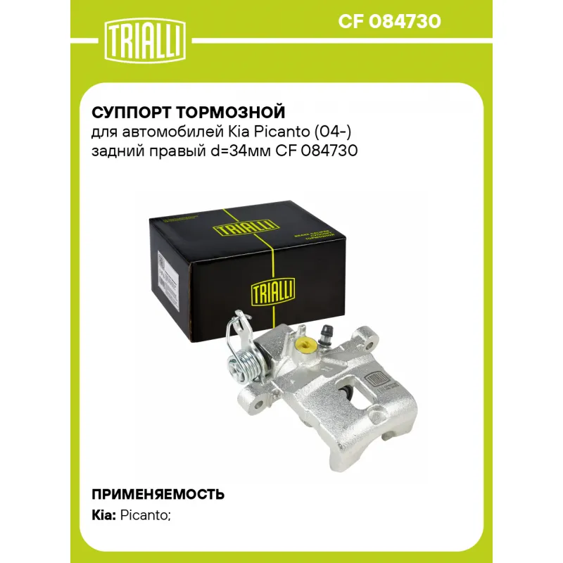 Суппорт тормозной для автомобилей Kia Picanto (04-) задний правый d=34мм Характеристики: Артикул: CF 084730 OEM номера: 5836007320 Сопутствующий товар: Ремкомплект суппорта: RCF 084729 Сопутствующий товар: Поршень суппорта: RCF 084730 Сопутствующий товар: Скоба суппорта: CF 012019 Сопутствующий товар: Суппорт тормозной: CF 084729 Парный товар: CF 084729 Количество на автомобиль: 1 Диаметр, мм: 34 Количество поршней: 1 Гарантийный срок: 2 года / 60 000 км Толщина тормозного диска, мм: 10 Тормозная система: MOBIS Сторона установки: Задняя ось справа Товарная линейка: BLACK Подходит для авто: Kia Picanto (04-) Для проверки применяемости отправьте VIN автомобиля через вкладку "Есть вопросы о товаре?" Комплектация: Скоба дискового тормозного механизма (суппорт тормозной без направляющей колодок) - 1 шт Гарантия: от 1 года.