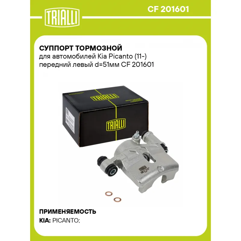 Суппорт тормозной для автомобилей Kia Picanto (11-) передний левый d=51мм Характеристики: Артикул: CF 201601 OEM номера: 58180 1YA30, 58110 1Y300 Тормозная система: MOBIS Диаметр, мм: 51 Гарантийный срок: 2 года / 60 000 км Количество поршней: 1 Толщина тормозного диска, мм: 18 Сторона установки: Передняя ось слева Парный товар: CF 201602 Количество на автомобиль: 1 Товарная линейка: BLACK Комплектация: Скоба дискового тормозного механизма (суппорт тормозной без направляющей колодок) - 1 шт Гарантия: от 1 года.