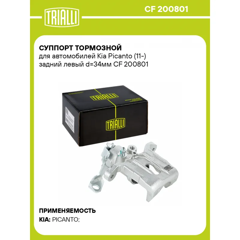 Суппорт тормозной для автомобилей Kia Picanto (11-) задний левый d=34мм Характеристики: Артикул: CF 200801 OEM номера: 58310 1Y500, 58310 1YA50 Тормозная система: MOBIS Диаметр, мм: 34 Гарантийный срок: 2 года / 60 000 км Количество поршней: 1 Толщина тормозного диска, мм: 10 Сторона установки: Задняя ось слева Сопутствующий товар: Ремкомплект суппорта: RCF 200801 Сопутствующий товар: Поршень суппорта: RCF 200802 Сопутствующий товар: Скоба суппорта: CF 200803 Сопутствующий товар: Суппорт тормозной: CF 200802 Парный товар: CF 200802 Количество на автомобиль: 1 Товарная линейка: BLACK Комплектация: Скоба дискового тормозного механизма (суппорт тормозной без направляющей колодок) - 1 шт Гарантия: от 1 года.