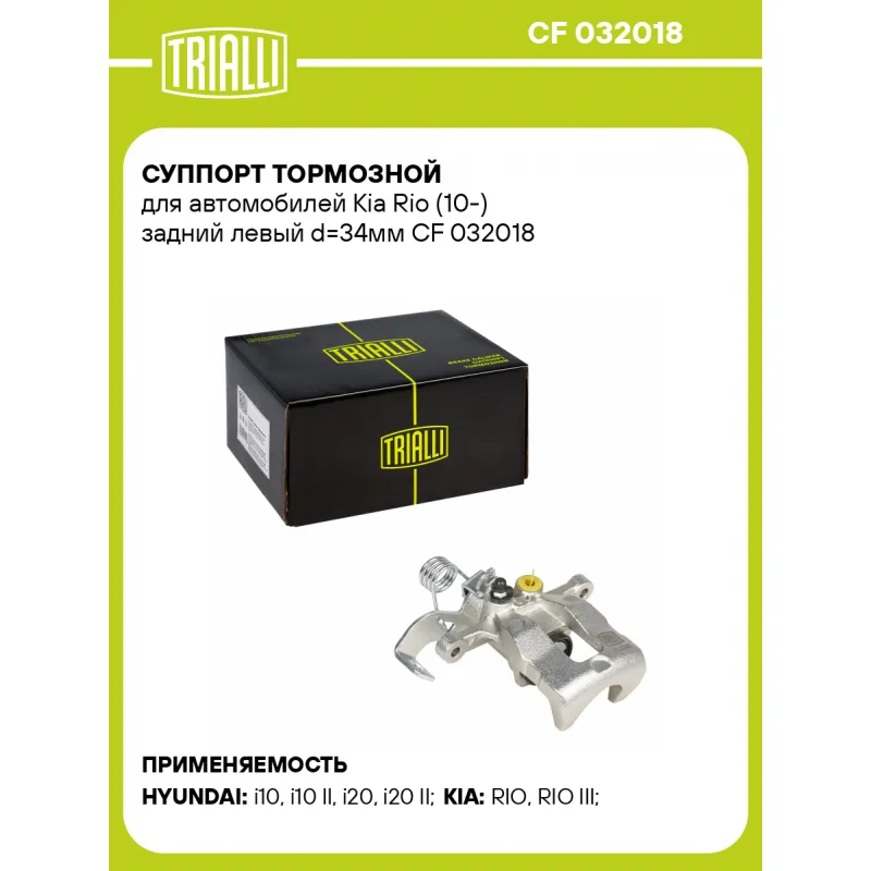 Суппорт тормозной для автомобилей Kia Rio (10-) задний левый d=34мм Характеристики: Артикул: CF 032018 OEM номера: 58210 B4300, 58210C8300 , 58310 B4A30, 58310C8A30 , 58300 1W350, 58310 1WA30 Гарантийный срок: 2 года / 60 000 км Сопутствующий товар: Ремкомплект суппорта: RCF 032019 Сопутствующий товар: Поршень суппорта: RCF 032019P Сопутствующий товар: Скоба суппорта: CF 105109 Сопутствующий товар: Суппорт тормозной: CF 032019 Парный товар: CF 032019 Количество на автомобиль: 1 Диаметр, мм: 34 Количество поршней: 1 Толщина тормозного диска, мм: 10 Тормозная система: MANDO Сторона установки: Задняя ось слева Товарная линейка: BLACK Комплектация: Скоба дискового тормозного механизма (суппорт тормозной без направляющей колодок) - 1 шт Гарантия: от 1 года.