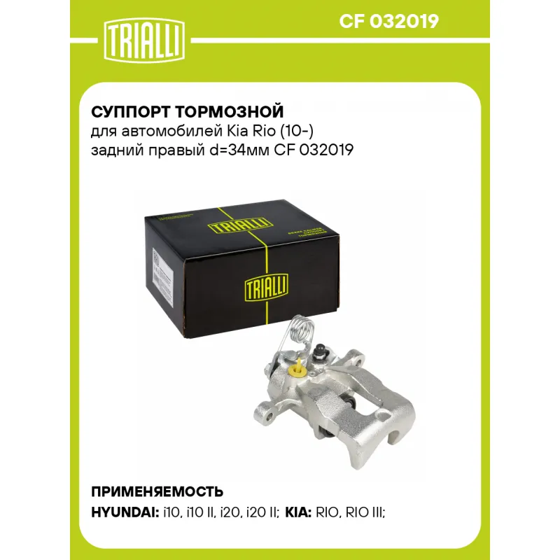 Суппорт тормозной для автомобилей Kia Rio (10-) задний правый d=34мм Характеристики: Артикул: CF 032019 OEM номера: 58230 B4300, 58230 C8300, 58311 B4A30, 58311 C8A30, 58311 1WA30, 58400 1W350 Гарантийный срок: 2 года / 60 000 км Сопутствующий товар: Ремкомплект суппорта: RCF 032019 Сопутствующий товар: Поршень суппорта: RCF 032019P Сопутствующий товар: Скоба суппорта: CF 105109 Сопутствующий товар: Суппорт тормозной: CF 032018 Парный товар: CF 032018 Количество на автомобиль: 1 Диаметр, мм: 34 Количество поршней: 1 Толщина тормозного диска, мм: 10 Тормозная система: MANDO Сторона установки: Задняя ось справа Товарная линейка: BLACK Комплектация: Скоба дискового тормозного механизма (суппорт тормозной без направляющей колодок) - 1 шт Гарантия: от 1 года.