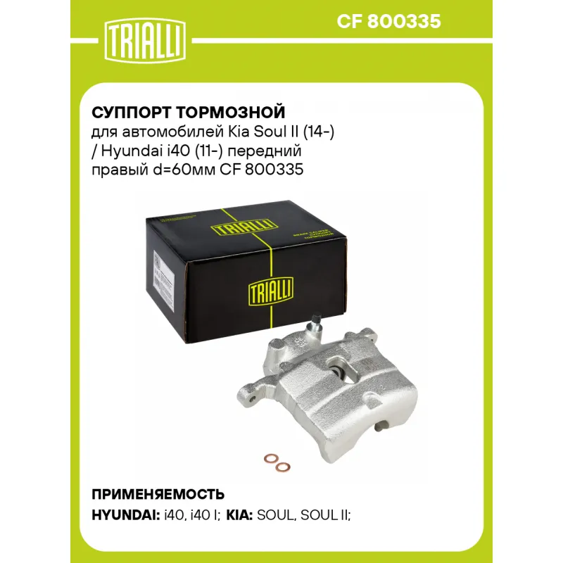 Суппорт тормозной для автомобилей Kia Soul II (14-) / Hyundai i40 (11-) передний правый d=60мм Характеристики: Артикул: CF 800335 OEM номера: 58130 3Z100, 58190 3ZA00, 58130B2600, 58190B2A60 Тормозная система: MOBIS Диаметр, мм: 60 Гарантийный срок: 2 года / 60 000 км Количество поршней: 1 Толщина тормозного диска, мм: 28 Сторона установки: Передняя ось справа Сопутствующий товар: Ремкомплект суппорта: RCF 800334 Сопутствующий товар: Поршень суппорта: RCF 800335 Сопутствующий товар: Скоба суппорта: CF 800336 Сопутствующий товар: Суппорт тормозной: CF 800334 Парный товар: CF 800334 Количество на автомобиль: 1 Товарная линейка: BLACK Комплектация: Скоба дискового тормозного механизма (суппорт тормозной без направляющей колодок) - 1 шт Гарантия: от 1 года.