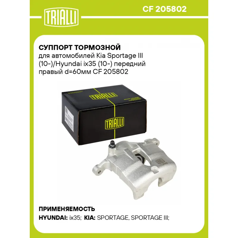 Суппорт тормозной для автомобилей Kia Sportage III (10-)/Hyundai ix35 (10-) передний правый d=60мм Характеристики: Артикул: CF 205802 OEM номера: 58130 2Y000, 58190 2SA70, 58130 2S700 Тормозная система: MOBIS Диаметр, мм: 60 Гарантийный срок: 2 года / 60 000 км Количество поршней: 1 Толщина тормозного диска, мм: 28 Сторона установки: Передняя ось справа Сопутствующий товар: Ремкомплект суппорта: RCF 205801 Сопутствующий товар: Поршень суппорта: RCF 205802 Сопутствующий товар: Скоба суппорта: CF 205803 Сопутствующий товар: Суппорт тормозной: CF 205801 Парный товар: CF 205801 Количество на автомобиль: 1 Товарная линейка: BLACK Комплектация: Скоба дискового тормозного механизма (суппорт тормозной без направляющей колодок) - 1 шт Гарантия: от 1 года.
