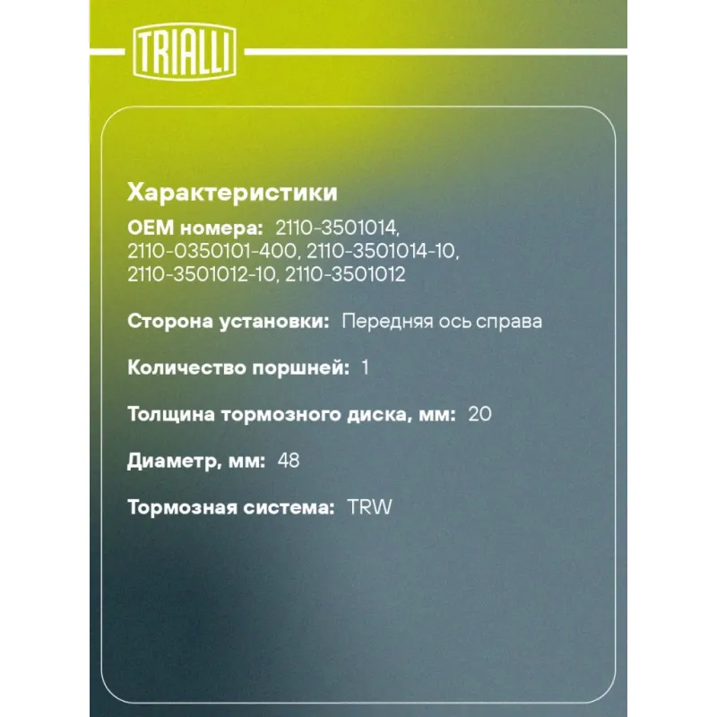 Суппорт тормозной для автомобилей Лада 2110 передний правый d=48мм (R13) (в сборе со скобой) Характеристики: Артикул: CF 310 OEM номера: 2110-3501014, 2110-0350101-400, 2110-3501014-10, 2110-3501012-10, 2110-3501012 Сопутствующий товар: Ремкомплект суппорта: RCF 211 Сопутствующий товар: Поршень суппорта: RCF 212P Сопутствующий товар: Скоба суппорта: CF 350146 Сопутствующий товар: Суппорт тормозной: CF 210 Парный товар: CF 210 Количество на автомобиль: 1 Диаметр, мм: 48 Особенности конструкции:: R13 Количество поршней: 1 Гарантийный срок: 2 года / 60 000 км Толщина тормозного диска, мм: 20 Тормозная система: TRW Сторона установки: Передняя ось справа Товарная линейка: BLACK Подходит для авто: Datsun on-DO (14-), mi-DO (15-) ВАЗ Kalina (04-), 2110, 2110, 2111, 2112, Priora (07-), Kalina (04-), Kalina (04-), Kalina II (13-), Granta (10-), 2110, 2111, 2112 Для проверки применяемости отправьте VIN автомобиля через вкладку "Есть вопросы о товаре?" Комплектация: Скоба дискового тормозного механизма (суппорт тормозной в сборе с направляющей колодок) - 1 шт Гарантия: от 1 года.