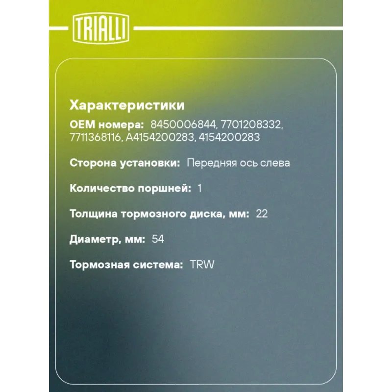 Суппорт тормозной для автомобилей Лада Vesta (15-) передний левый d=54мм (без скобы) Характеристики: Артикул: CF 012001 OEM номера: 8450006844, 7701208332, 7711368116, A4154200283, 4154200283 Сопутствующий товар: Ремкомплект суппорта: RCF 012001, RCF 012011 Сопутствующий товар: Поршень суппорта: RCF 012002 Сопутствующий товар: Скоба суппорта: CF 012092 Сопутствующий товар: Суппорт тормозной: CF 012002 Парный товар: CF 012002 Количество на автомобиль: 1 Диаметр, мм: 54 Количество поршней: 1 Гарантийный срок: 2 года / 60 000 км Толщина тормозного диска, мм: 22 Тормозная система: TRW Сторона установки: Передняя ось слева Товарная линейка: BLACK Комплектация: Скоба дискового тормозного механизма (суппорт тормозной без направляющей колодок) - 1 шт Гарантия: от 1 года.