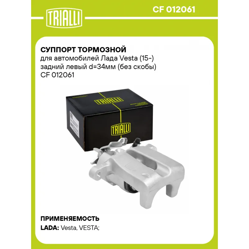 Суппорт тормозной для автомобилей Лада Vesta (15-) задний левый d=34мм (без скобы) Характеристики: Артикул: CF 012061 OEM номера: 8450031163 Сопутствующий товар: Ремкомплект суппорта: RCF 012061, RCF 012063 Сопутствующий товар: Поршень суппорта: RCF 012062 Сопутствующий товар: Скоба суппорта: CF 012094 Сопутствующий товар: Суппорт тормозной: CF 012062 Парный товар: CF 012062 Количество на автомобиль: 1 Диаметр, мм: 34 Количество поршней: 1 Гарантийный срок: 2 года / 60 000 км Толщина тормозного диска, мм: 11 Тормозная система: TRW Сторона установки: Задняя ось слева Товарная линейка: BLACK Комплектация: Скоба дискового тормозного механизма (суппорт тормозной без направляющей колодок) - 1 шт Гарантия: от 1 года.