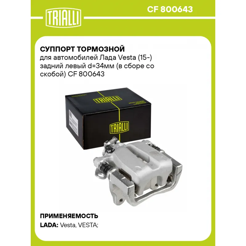 Суппорт тормозной для автомобилей Лада Vesta (15-) задний левый d=34мм (в сборе со скобой) Характеристики: Артикул: CF 800643 OEM номера: 8450031163 Сопутствующий товар: Ремкомплект суппорта: RCF 012061, RCF 012063 Сопутствующий товар: Поршень суппорта: RCF 012062 Сопутствующий товар: Скоба суппорта: CF 012094 Парный товар: CF 800644 Количество на автомобиль: 1 Диаметр, мм: 34 Количество поршней: 1 Гарантийный срок: 2 года / 60 000 км Толщина тормозного диска, мм: 11 Тормозная система: TRW Сторона установки: Задняя ось слева Товарная линейка: BLACK Комплектация: Скоба дискового тормозного механизма (суппорт тормозной в сборе с направляющей колодок) - 1 шт Гарантия: от 1 года.