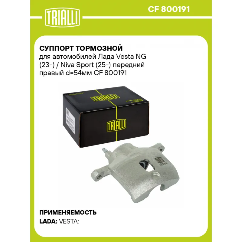 Суппорт тормозной для автомобилей Лада Vesta NG (23-) / Niva Sport (25-) передний правый d=54мм Характеристики: Артикул: CF 800191 OEM номера: 8460013692, 8450043423, 8450045759 Диаметр, мм: 54 Гарантийный срок: 2 года / 60 000 км Количество поршней: 1 Сторона установки: Передняя ось справа Сопутствующий товар: Ремкомплект суппорта: RCF 800191 Сопутствующий товар: Поршень суппорта: RCF 800192 Сопутствующий товар: Скоба суппорта: CF 800192 Сопутствующий товар: Суппорт тормозной: CF 800192 Парный товар: CF 800190 Количество на автомобиль: 1 Товарная линейка: BLACK Комплектация: Скоба дискового тормозного механизма (суппорт тормозной без направляющей колодок) - 1 шт Гарантия: от 1 года.