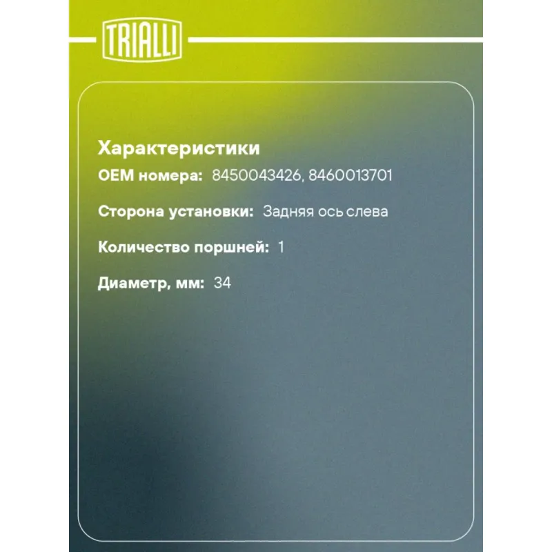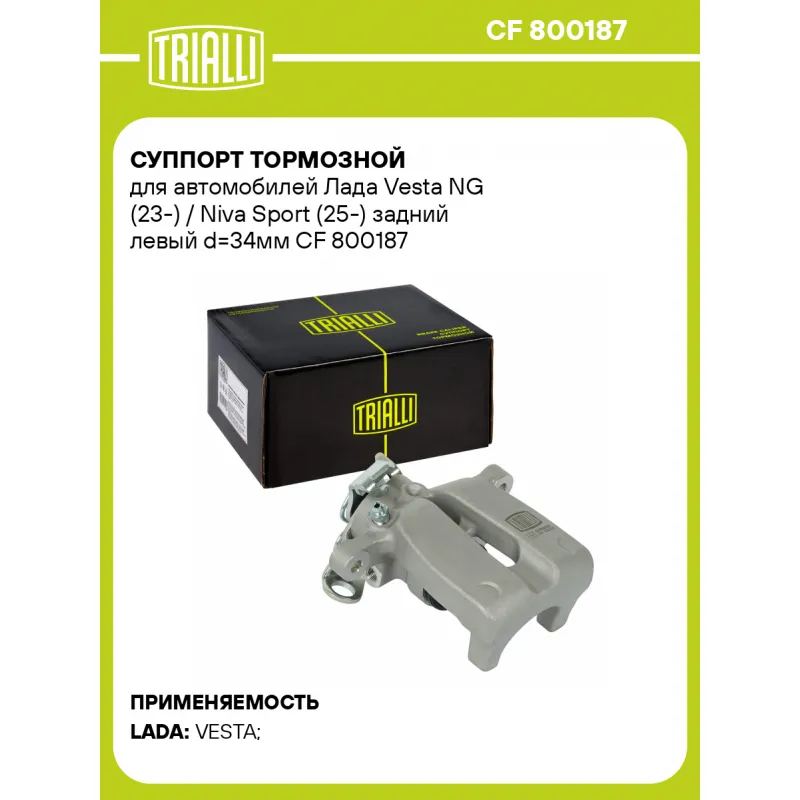 Суппорт тормозной для автомобилей Лада Vesta NG (23-) / Niva Sport (25-) задний левый d=34мм Характеристики: Артикул: CF 800187 OEM номера: 8450043426, 8460013701 Диаметр, мм: 34 Гарантийный срок: 2 года / 60 000 км Количество поршней: 1 Сторона установки: Задняя ось слева Сопутствующий товар: Ремкомплект суппорта: RCF 800187 Сопутствующий товар: Поршень суппорта: RCF 800188 Сопутствующий товар: Скоба суппорта: CF 800189 Сопутствующий товар: Суппорт тормозной: CF 800188 Парный товар: CF 800188 Количество на автомобиль: 1 Товарная линейка: BLACK Комплектация: Скоба дискового тормозного механизма (суппорт тормозной без направляющей колодок) - 1 шт Гарантия: от 1 года.