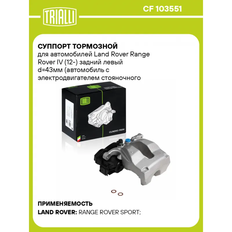 Суппорт тормозной для автомобилей Land Rover Range Rover IV (12-) задний левый d=43мм (автомобиль с электродвигателем стояночного тормоза) Характеристики: Артикул: CF 103551 OEM номера: LR036568 Сопутствующий товар: Ремкомплект суппорта: RCF 302007 Сопутствующий товар: Поршень суппорта: RCF 103552 Сопутствующий товар: Электродвигатель суппорта: RCF 103651 Сопутствующий товар: Суппорт тормозной: CF 103552 Парный товар: CF 103552 Количество на автомобиль: 1 Диаметр, мм: 43 Особенности конструкции:: Для автомобилей с электрическим стояночным тормозом Количество поршней: 1 Гарантийный срок: 2 года / 60 000 км Толщина тормозного диска, мм: 25 Тормозная система: TRW Сторона установки: Задняя ось слева Товарная линейка: BLACK Комплектация: Скоба дискового тормозного механизма (суппорт тормозной без направляющей колодок) - 1 шт Гарантия: от 1 года.