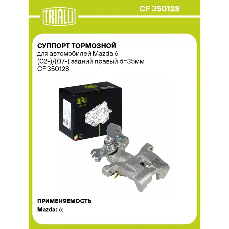 Суппорт тормозной для автомобилей Mazda 6 (02-)/(07-) задний правый d=35мм Характеристики: Артикул: CF 350128 OEM номера: GJ6A2661XC Сопутствующий товар: Ремкомплект суппорта: RCF 350127 Сопутствующий товар: Поршень суппорта: RCF 350128 Сопутствующий товар: Суппорт тормозной: CF 350127 Парный товар: CF 350127 Количество на автомобиль: 1 Диаметр, мм: 35 Количество поршней: 1 Гарантийный срок: 2 года / 60 000 км Толщина тормозного диска, мм: 10 Тормозная система: AKEBONO Сторона установки: Задняя ось справа Товарная линейка: BLACK Подходит для авто: Mazda 6 (02-), 6 (07-), 6 (02-) Для проверки применяемости отправьте VIN автомобиля через вкладку "Есть вопросы о товаре?" Комплектация: Скоба дискового тормозного механизма (суппорт тормозной без направляющей колодок) - 1 шт Гарантия: от 1 года.