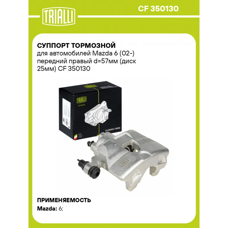 Суппорт тормозной для автомобилей Mazda 6 (02-) передний правый d=57мм (диск 25мм) Характеристики: Артикул: CF 350130 OEM номера: GJ6E3361XB, GJ6E3361XC Сопутствующий товар: Ремкомплект суппорта: RCF 350129 Сопутствующий товар: Поршень суппорта: RCF 350130 Сопутствующий товар: Суппорт тормозной: CF 350129 Парный товар: CF 350129 Количество на автомобиль: 1 Диаметр, мм: 57 Количество поршней: 1 Гарантийный срок: 2 года / 60 000 км Толщина тормозного диска, мм: 25 Тормозная система: NBK Сторона установки: Передняя ось справа Товарная линейка: BLACK Подходит для авто: Mazda 6 (02-), 6 (02-) Для проверки применяемости отправьте VIN автомобиля через вкладку "Есть вопросы о товаре?" Комплектация: Скоба дискового тормозного механизма (суппорт тормозной без направляющей колодок) - 1 шт Гарантия: от 1 года.