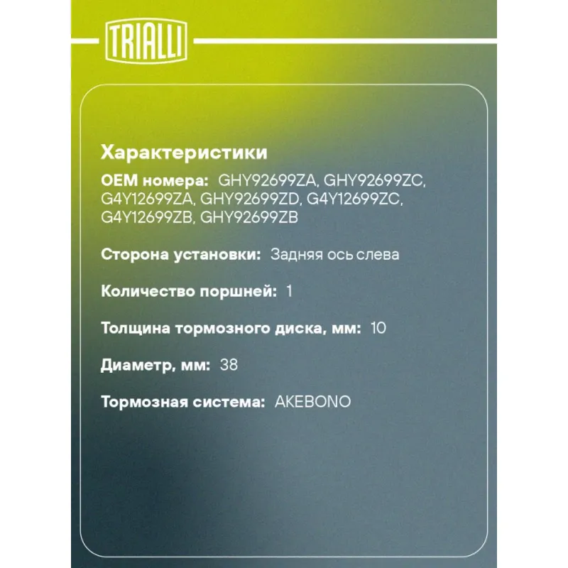 Суппорт тормозной для автомобилей Mazda 6 (13-) задний левый d=38мм Характеристики: Артикул: CF 206401 OEM номера: GHY92699ZA, GHY92699ZC, G4Y12699ZA, GHY92699ZD, G4Y12699ZC, G4Y12699ZB, GHY92699ZB Тормозная система: AKEBONO Диаметр, мм: 38 Гарантийный срок: 2 года / 60 000 км Количество поршней: 1 Толщина тормозного диска, мм: 10 Сторона установки: Задняя ось слева Сопутствующий товар: Ремкомплект суппорта: RCF 206401 Сопутствующий товар: Поршень суппорта: RCF 206402 Сопутствующий товар: Скоба суппорта: CF 206403 Сопутствующий товар: Суппорт тормозной: CF 206402 Парный товар: CF 206402 Количество на автомобиль: 1 Товарная линейка: BLACK Комплектация: Скоба дискового тормозного механизма (суппорт тормозной без направляющей колодок) - 1 шт Гарантия: от 1 года.