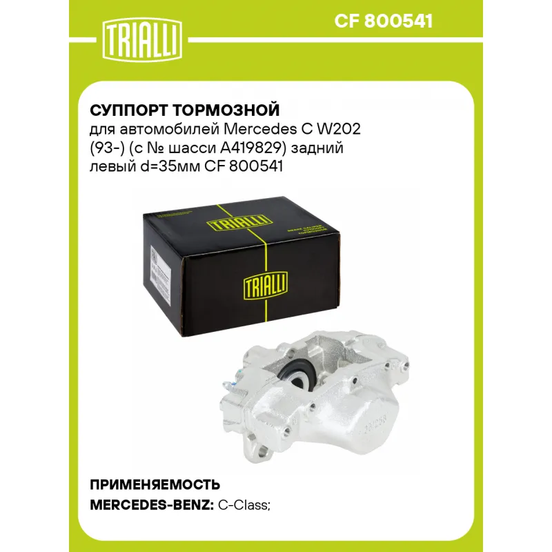 Суппорт тормозной для автомобилей Mercedes C W202 (93-) (с № шасси A419829) задний левый d=35мм Характеристики: Артикул: CF 800541 OEM номера: 001 420 55 83, A001 420 55 83 Особенности конструкции:: С № шасси A419829 Тормозная система: ATE Диаметр, мм: 35 Гарантийный срок: 2 года / 60 000 км Количество поршней: 2 Толщина тормозного диска, мм: 9 Сторона установки: Задняя ось слева Сопутствующий товар: Ремкомплект суппорта: RCF 800541 Сопутствующий товар: Поршень суппорта: RCF 800542 Сопутствующий товар: Скоба суппорта: CF 800543 Сопутствующий товар: Суппорт тормозной: CF 800542 Парный товар: CF 800542 Количество на автомобиль: 1 Товарная линейка: BLACK Комплектация: Скоба дискового тормозного механизма (суппорт тормозной без направляющей колодок) - 1 шт Гарантия: от 1 года.