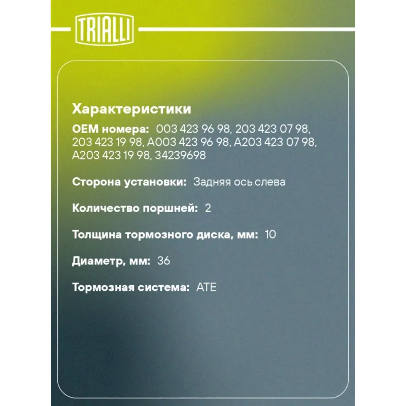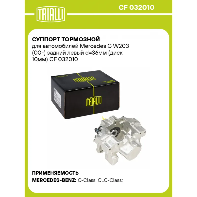 Суппорт тормозной для автомобилей Mercedes C W203 (00-) задний левый d=36мм (диск 10мм) Характеристики: Артикул: CF 032010 OEM номера: 003 423 96 98, 203 423 07 98, 203 423 19 98, A003 423 96 98, A203 423 07 98, A203 423 19 98, 34239698 Гарантийный срок: 2 года / 60 000 км Сопутствующий товар: Ремкомплект суппорта: RCF 032001 Сопутствующий товар: Поршень суппорта: RCF 032001P Сопутствующий товар: Скоба суппорта: CF 185168 Сопутствующий товар: Суппорт тормозной: CF 032011 Парный товар: CF 032011 Количество на автомобиль: 1 Диаметр, мм: 36 Количество поршней: 2 Толщина тормозного диска, мм: 10 Тормозная система: ATE Сторона установки: Задняя ось слева Товарная линейка: BLACK Комплектация: Скоба дискового тормозного механизма (суппорт тормозной без направляющей колодок) - 1 шт Гарантия: от 1 года.