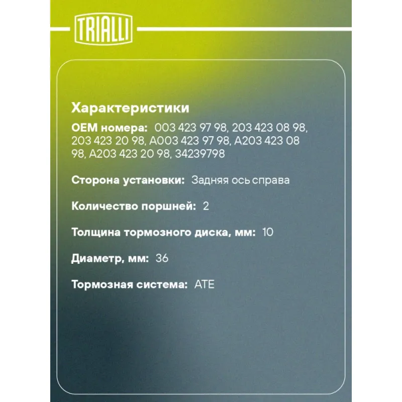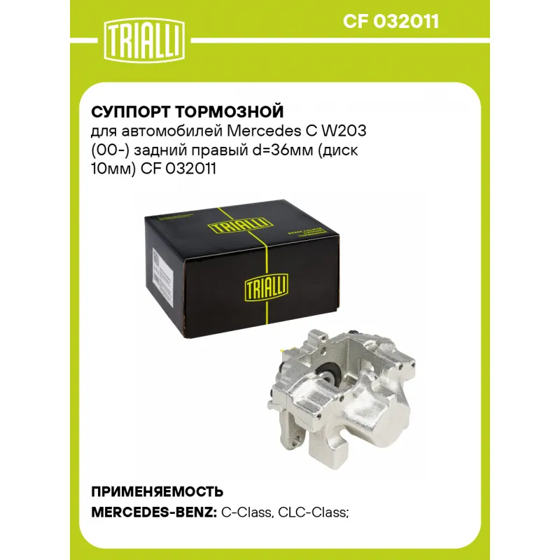 Суппорт тормозной для автомобилей Mercedes C W203 (00-) задний правый d=36мм (диск 10мм) Характеристики: Артикул: CF 032011 OEM номера: 003 423 97 98, 203 423 08 98, 203 423 20 98, A003 423 97 98, A203 423 08 98, A203 423 20 98, 34239798 Гарантийный срок: 2 года / 60 000 км Сопутствующий товар: Ремкомплект суппорта: RCF 032001 Сопутствующий товар: Поршень суппорта: RCF 032001P Сопутствующий товар: Скоба суппорта: CF 185168 Сопутствующий товар: Суппорт тормозной: CF 032010 Парный товар: CF 032010 Количество на автомобиль: 1 Диаметр, мм: 36 Количество поршней: 2 Толщина тормозного диска, мм: 10 Тормозная система: ATE Сторона установки: Задняя ось справа Товарная линейка: BLACK Комплектация: Скоба дискового тормозного механизма (суппорт тормозной без направляющей колодок) - 1 шт Гарантия: от 1 года.