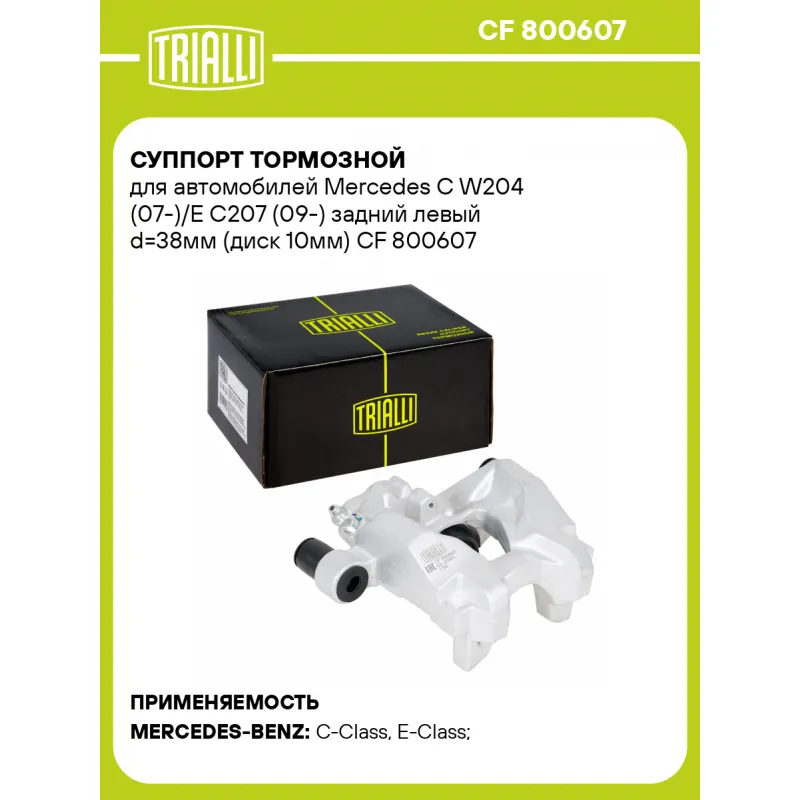 Суппорт тормозной для автомобилей Mercedes C W204 (07-)/E C207 (09-) задний левый d=38мм (диск 10мм) Характеристики: Артикул: CF 800607 OEM номера: 204 423 15 81, A204 423 15 81 Тормозная система: ATE Диаметр, мм: 38 Гарантийный срок: 2 года / 60 000 км Количество поршней: 1 Толщина тормозного диска, мм: 10 Сторона установки: Задняя ось слева Сопутствующий товар: Ремкомплект суппорта: RCF 800607 Сопутствующий товар: Поршень суппорта: RCF 800608 Сопутствующий товар: Скоба суппорта: CF 800609 Сопутствующий товар: Суппорт тормозной: CF 800608 Парный товар: CF 800608 Количество на автомобиль: 1 Товарная линейка: BLACK Комплектация: Скоба дискового тормозного механизма (суппорт тормозной без направляющей колодок) - 1 шт Гарантия: от 1 года.