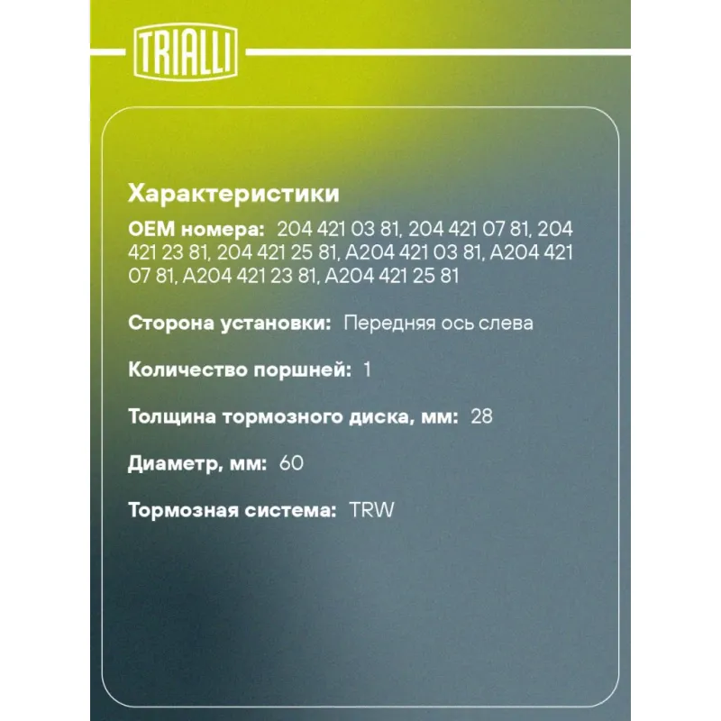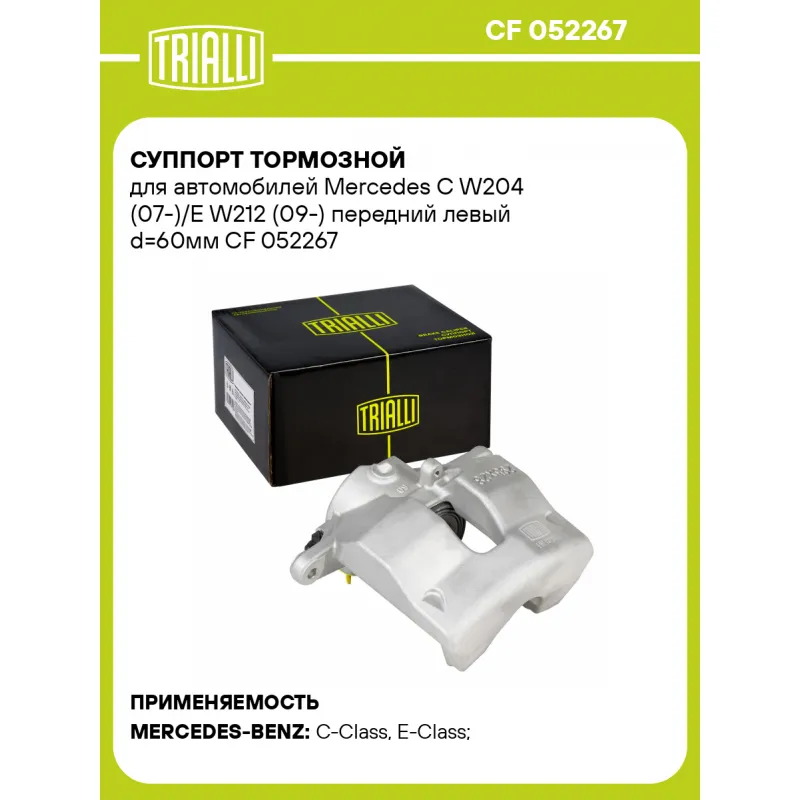 Суппорт тормозной для автомобилей Mercedes C W204 (07-)/E W212 (09-) передний левый d=60мм Характеристики: Артикул: CF 052267 OEM номера: 204 421 03 81, 204 421 07 81, 204 421 23 81, 204 421 25 81, A204 421 03 81, A204 421 07 81, A204 421 23 81, A204 421 25 81 Гарантийный срок: 2 года / 60 000 км Сопутствующий товар: Ремкомплект суппорта: RCF 052267 Сопутствующий товар: Поршень суппорта: RCF 052268 Сопутствующий товар: Скоба суппорта: CF 052208 Сопутствующий товар: Суппорт тормозной: CF 052268 Парный товар: CF 052268 Количество на автомобиль: 1 Диаметр, мм: 60 Количество поршней: 1 Толщина тормозного диска, мм: 28 Тормозная система: TRW Сторона установки: Передняя ось слева Товарная линейка: BLACK Комплектация: Скоба дискового тормозного механизма (суппорт тормозной без направляющей колодок) - 1 шт Гарантия: от 1 года.