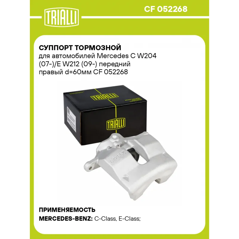 Суппорт тормозной для автомобилей Mercedes C W204 (07-)/E W212 (09-) передний правый d=60мм Характеристики: Артикул: CF 052268 OEM номера: 204 421 04 81, 204 421 08 81, 204 421 24 81, 204 421 26 81, A204 421 04 81, A204 421 08 81, A204 421 24 81, A204 421 26 81 Гарантийный срок: 2 года / 60 000 км Сопутствующий товар: Ремкомплект суппорта: RCF 052267 Сопутствующий товар: Поршень суппорта: RCF 052268 Сопутствующий товар: Скоба суппорта: CF 052208 Сопутствующий товар: Суппорт тормозной: CF 052267 Парный товар: CF 052267 Количество на автомобиль: 1 Диаметр, мм: 60 Количество поршней: 1 Толщина тормозного диска, мм: 28 Тормозная система: TRW Сторона установки: Передняя ось справа Товарная линейка: BLACK Комплектация: Скоба дискового тормозного механизма (суппорт тормозной без направляющей колодок) - 1 шт Гарантия: от 1 года.