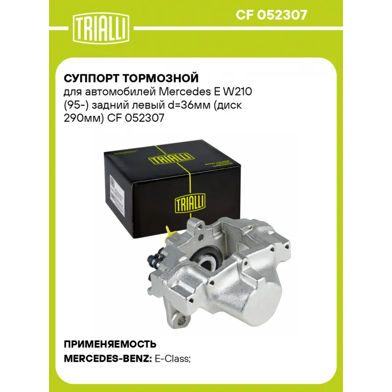 Суппорт тормозной для автомобилей Mercedes E W210 (95-) задний левый d=36мм (диск 290мм) Характеристики: Артикул: CF 052307 OEM номера: 001 420 57 83, A001 420 57 83, 14205783 Гарантийный срок: 2 года / 60 000 км Сопутствующий товар: Ремкомплект суппорта: RCF 052307 Сопутствующий товар: Поршень суппорта: RCF 052308 Сопутствующий товар: Скоба суппорта: CF 052206 Сопутствующий товар: Суппорт тормозной: CF 052308 Диаметр тормозного диска, мм: 290 Парный товар: CF 052308 Количество на автомобиль: 1 Диаметр, мм: 36 Количество поршней: 2 Толщина тормозного диска, мм: 10 Тормозная система: ATE Сторона установки: Задняя ось слева Товарная линейка: BLACK Комплектация: Скоба дискового тормозного механизма (суппорт тормозной без направляющей колодок) - 1 шт Гарантия: от 1 года.
