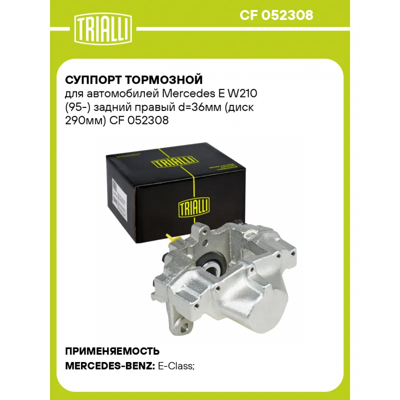 Суппорт тормозной для автомобилей Mercedes E W210 (95-) задний правый d=36мм (диск 290мм) Характеристики: Артикул: CF 052308 OEM номера: 001 420 58 83, A001 420 58 83, 14205883 Гарантийный срок: 2 года / 60 000 км Сопутствующий товар: Ремкомплект суппорта: RCF 052307 Сопутствующий товар: Поршень суппорта: RCF 052308 Сопутствующий товар: Скоба суппорта: CF 052206 Сопутствующий товар: Суппорт тормозной: CF 052307 Диаметр тормозного диска, мм: 290 Парный товар: CF 052307 Количество на автомобиль: 1 Диаметр, мм: 36 Количество поршней: 2 Толщина тормозного диска, мм: 10 Тормозная система: ATE Сторона установки: Задняя ось справа Товарная линейка: BLACK Комплектация: Скоба дискового тормозного механизма (суппорт тормозной без направляющей колодок) - 1 шт Гарантия: от 1 года.