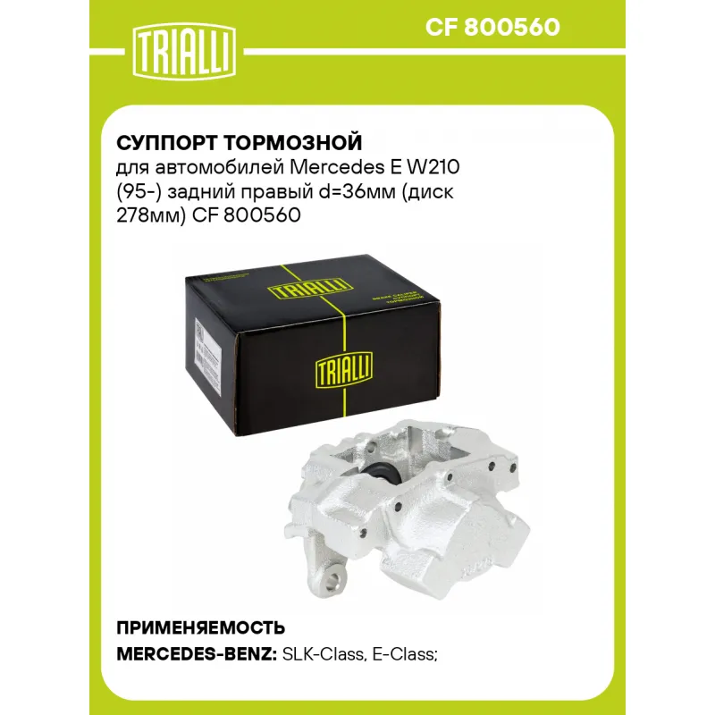Суппорт тормозной для автомобилей Mercedes E W210 (95-) задний правый d=36мм (диск 278мм) Характеристики: Артикул: CF 800560 OEM номера: 001 420 51 83, A001 420 51 83 Тормозная система: ATE Диаметр, мм: 36 Гарантийный срок: 2 года / 60 000 км Количество поршней: 2 Толщина тормозного диска, мм: 9 Сторона установки: Задняя ось справа Сопутствующий товар: Ремкомплект суппорта: RCF 800559 Сопутствующий товар: Поршень суппорта: RCF 800560 Сопутствующий товар: Скоба суппорта: CF 800561 Сопутствующий товар: Суппорт тормозной: CF 800559 Диаметр тормозного диска, мм: 278 Парный товар: CF 800559 Количество на автомобиль: 1 Товарная линейка: BLACK Комплектация: Скоба дискового тормозного механизма (суппорт тормозной без направляющей колодок) - 1 шт Гарантия: от 1 года.