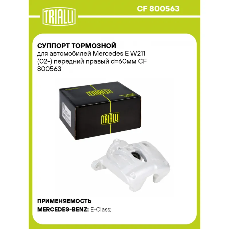 Суппорт тормозной для автомобилей Mercedes E W211 (02-) передний правый d=60мм Характеристики: Артикул: CF 800563 OEM номера: 002 420 42 83, 003 420 02 83, A002 420 42 83, A003 420 02 83 Тормозная система: BOSCH Диаметр, мм: 60 Гарантийный срок: 2 года / 60 000 км Количество поршней: 1 Толщина тормозного диска, мм: 28 Сторона установки: Передняя ось справа Сопутствующий товар: Ремкомплект суппорта: RCF 800562 Сопутствующий товар: Поршень суппорта: RCF 800563 Сопутствующий товар: Скоба суппорта: CF 800564 Сопутствующий товар: Суппорт тормозной: CF 800562 Парный товар: CF 800562 Количество на автомобиль: 1 Товарная линейка: BLACK Комплектация: Скоба дискового тормозного механизма (суппорт тормозной без направляющей колодок) - 1 шт Гарантия: от 1 года.