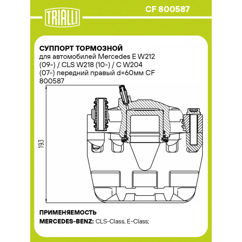 Суппорт тормозной для автомобилей Mercedes E W212 (09-) / CLS W218 (10-) / C W204 (07-) передний правый d=60мм Характеристики: Артикул: CF 800587 OEM номера: A204 421 10 81, A204 421 36 81, 204 421 10 81, 204 421 36 81 Тормозная система: TRW Диаметр, мм: 60 Гарантийный срок: 2 года / 60 000 км Количество поршней: 1 Толщина тормозного диска, мм: 32 Сторона установки: Передняя ось справа Сопутствующий товар: Ремкомплект суппорта: RCF 800586 Сопутствующий товар: Поршень суппорта: RCF 800587 Сопутствующий товар: Скоба суппорта: CF 800588 Сопутствующий товар: Суппорт тормозной: CF 800586 Диаметр тормозного диска, мм: 322 Парный товар: CF 800586 Количество на автомобиль: 1 Товарная линейка: BLACK Комплектация: Скоба дискового тормозного механизма (суппорт тормозной без направляющей колодок) - 1 шт Гарантия: от 1 года.
