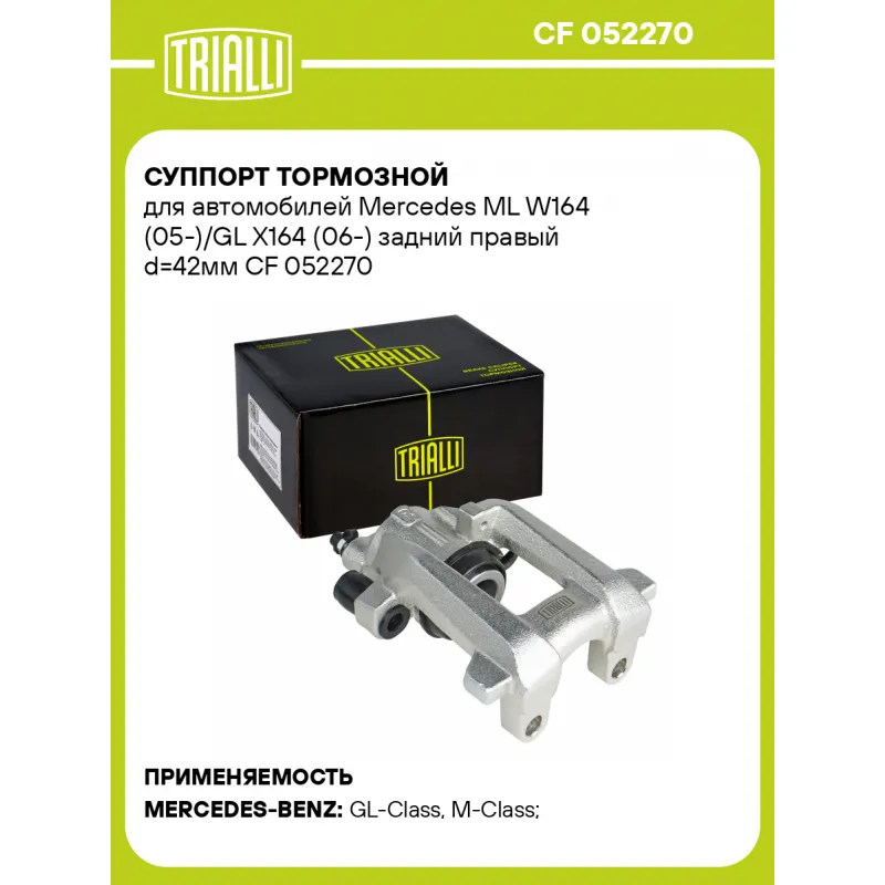 Суппорт тормозной для автомобилей Mercedes ML W164 (05-)/GL X164 (06-) задний правый d=42мм Характеристики: Артикул: CF 052270 OEM номера: 003 420 43 83, 004 420 40 83, A003 420 43 83, A004 420 40 83, 44204083, 34204383 Гарантийный срок: 2 года / 60 000 км Сопутствующий товар: Ремкомплект суппорта: RCF 052269 Сопутствующий товар: Поршень суппорта: RCF 052270 Сопутствующий товар: Скоба суппорта: CF 052205 Сопутствующий товар: Суппорт тормозной: CF 052269 Парный товар: CF 052269 Количество на автомобиль: 1 Диаметр, мм: 42 Количество поршней: 1 Толщина тормозного диска, мм: 22 Тормозная система: ATE Сторона установки: Задняя ось справа Товарная линейка: BLACK Комплектация: Скоба дискового тормозного механизма (суппорт тормозной без направляющей колодок) - 1 шт Гарантия: от 1 года.