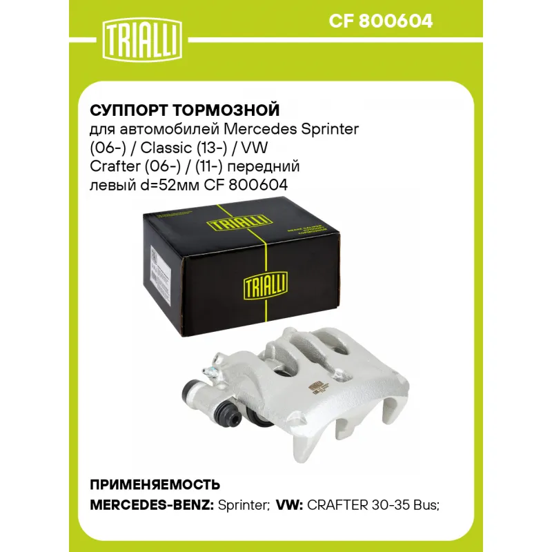 Суппорт тормозной для автомобилей Mercedes Sprinter (06-) / Classic (13-) / VW Crafter (06-) / (11-) передний левый d=52мм Характеристики: Артикул: CF 800604 OEM номера: 003 420 87 83, 004 420 57 83, A003 420 87 83, A004 420 57 83, 2E0 615 101 A, 2E0 615 105 A, 2E0 615 105 C, 2E0 615 105 Тормозная система: BREMBO Диаметр, мм: 52 Гарантийный срок: 2 года / 60 000 км Количество поршней: 2 Толщина тормозного диска, мм: 28 Сторона установки: Передняя ось слева Сопутствующий товар: Ремкомплект суппорта: RCF 800604 Сопутствующий товар: Поршень суппорта: RCF 800605 Сопутствующий товар: Скоба суппорта: CF 800606 Сопутствующий товар: Суппорт тормозной: CF 800605 Парный товар: CF 800605 Количество на автомобиль: 1 Товарная линейка: BLACK Комплектация: Скоба дискового тормозного механизма (суппорт тормозной без направляющей колодок) - 1 шт Гарантия: от 1 года.