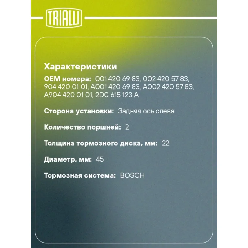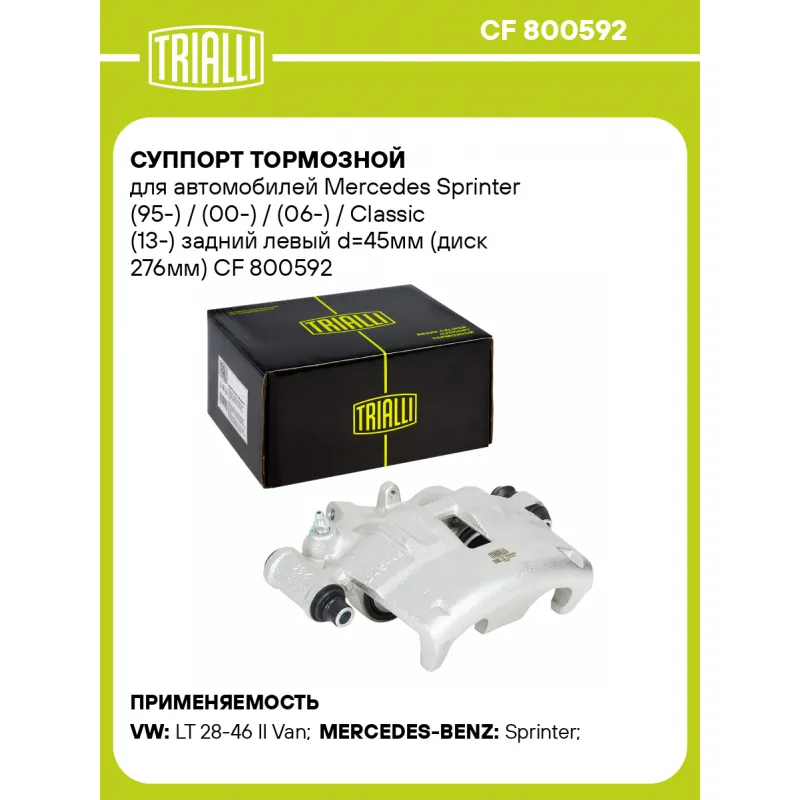 Суппорт тормозной для автомобилей Mercedes Sprinter (95-) / (00-) / (06-) / Classic (13-) задний левый d=45мм (диск 276мм) Характеристики: Артикул: CF 800592 OEM номера: 001 420 69 83, 002 420 57 83, 904 420 01 01, A001 420 69 83, A002 420 57 83, A904 420 01 01, 2D0 615 123 A Тормозная система: BOSCH Диаметр, мм: 45 Гарантийный срок: 2 года / 60 000 км Количество поршней: 2 Толщина тормозного диска, мм: 22 Сторона установки: Задняя ось слева Сопутствующий товар: Ремкомплект суппорта: RCF 800592 Сопутствующий товар: Поршень суппорта: RCF 800593 Сопутствующий товар: Скоба суппорта: CF 800594 Сопутствующий товар: Суппорт тормозной: CF 800593 Диаметр тормозного диска, мм: 276 Парный товар: CF 800593 Количество на автомобиль: 1 Товарная линейка: BLACK Комплектация: Скоба дискового тормозного механизма (суппорт тормозной без направляющей колодок) - 1 шт Гарантия: от 1 года.