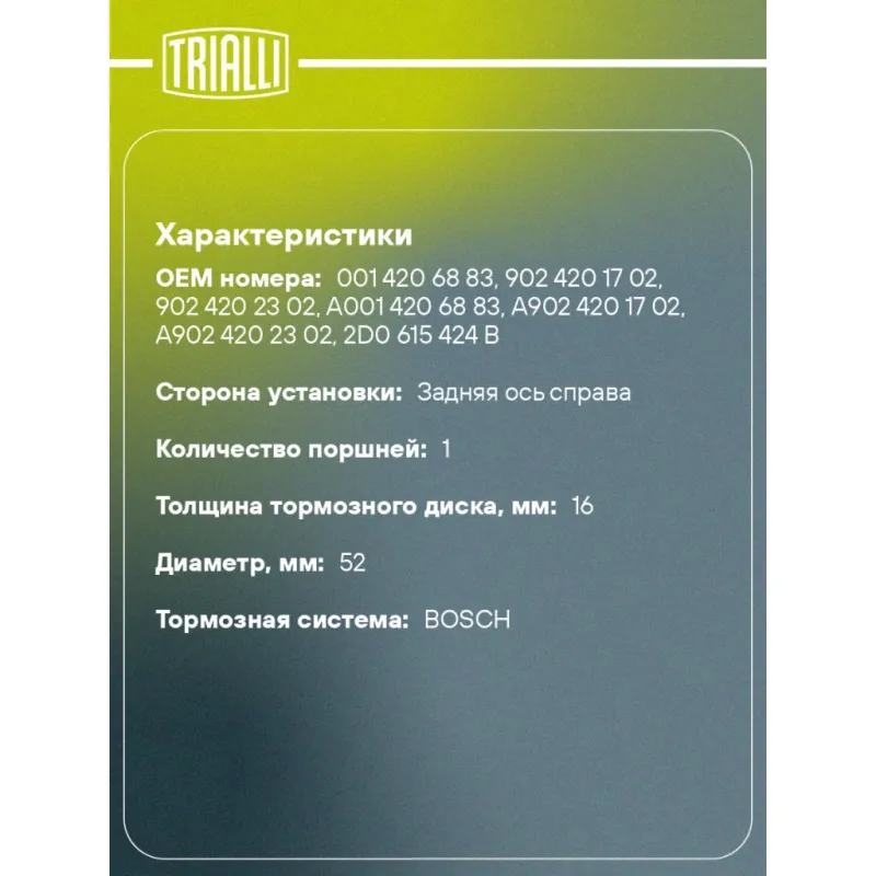Суппорт тормозной для автомобилей Mercedes Sprinter (95-) / (00-) / Classic (13-) / VW LT (96-) (тормозная система Bosch) задний правый d=52мм Характеристики: Артикул: CF 800572 OEM номера: 001 420 68 83, 902 420 17 02, 902 420 23 02, A001 420 68 83, A902 420 17 02, A902 420 23 02, 2D0 615 424 B Тормозная система: BOSCH Диаметр, мм: 52 Гарантийный срок: 2 года / 60 000 км Количество поршней: 1 Толщина тормозного диска, мм: 16 Сторона установки: Задняя ось справа Сопутствующий товар: Ремкомплект суппорта: RCF 800571 Сопутствующий товар: Поршень суппорта: RCF 800572 Сопутствующий товар: Скоба суппорта: CF 800573 Сопутствующий товар: Суппорт тормозной: CF 800571 Диаметр тормозного диска, мм: 272 Парный товар: CF 800571 Количество на автомобиль: 1 Товарная линейка: BLACK Комплектация: Скоба дискового тормозного механизма (суппорт тормозной без направляющей колодок) - 1 шт Гарантия: от 1 года.