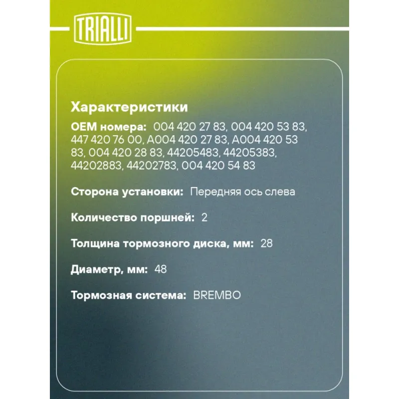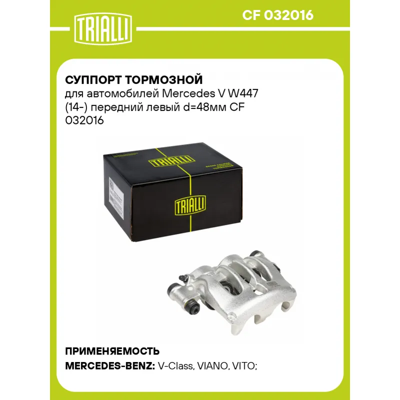 Суппорт тормозной для автомобилей Mercedes V W447 (14-) передний левый d=48мм Характеристики: Артикул: CF 032016 OEM номера: 004 420 27 83, 004 420 53 83, 447 420 76 00, A004 420 27 83, A004 420 53 83, 004 420 28 83, 44205483, 44205383, 44202883, 44202783, 004 420 54 83, 447 420 77 00, A004 420 28 83, A004 420 54 83, A4474207600, A4474207700 Гарантийный срок: 2 года / 60 000 км Сопутствующий товар: Ремкомплект суппорта: RCF 032017 Сопутствующий товар: Поршень суппорта: RCF 032017P Сопутствующий товар: Скоба суппорта: CF 190615 Сопутствующий товар: Суппорт тормозной: CF 032017 Парный товар: CF 032017 Количество на автомобиль: 1 Диаметр, мм: 48 Количество поршней: 2 Толщина тормозного диска, мм: 28 Тормозная система: BREMBO Сторона установки: Передняя ось слева Товарная линейка: BLACK Комплектация: Скоба дискового тормозного механизма (суппорт тормозной без направляющей колодок) - 1 шт Гарантия: от 1 года.
